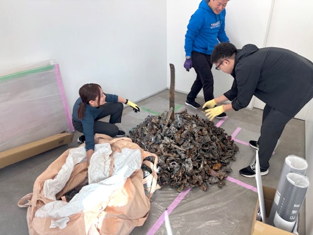 写真は、展示準備から会場での設営、そして完成した展示の様子です。当社で回収・選別した素材が、アート・デザインの視点から再解釈され、持続可能な社会に向けた新たな価値創造の可能性を提示しました。