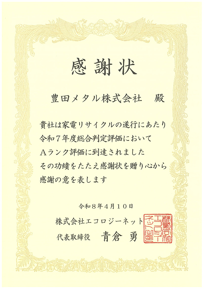 豊田メタル株式会社は、株式会社エコロジーネット様より、令和7年度家電リサイクル総合評価においてAランク評価をいただき、感謝状を拝受いたしました。